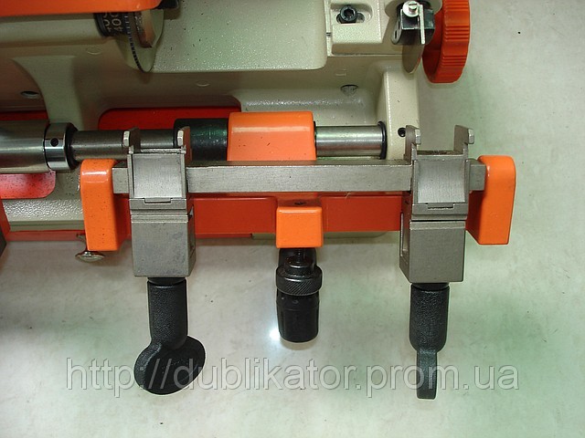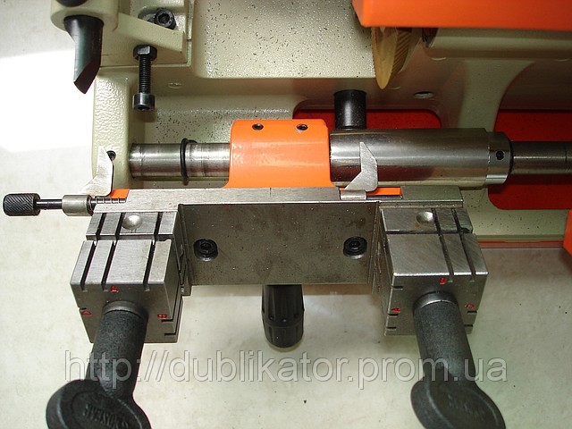 Универсальный станок совмещает четырехсторонние тиски для нарезки квартирных и автомобильных дубликатов в левой части станка. В правой половине размещена поворотная комбинированная каретка для бородкових-гаражных-сейфовых и финских ключей типа ABLOY. Диаметр фрез 80 мм. Две скорости резания назначаются переключателем